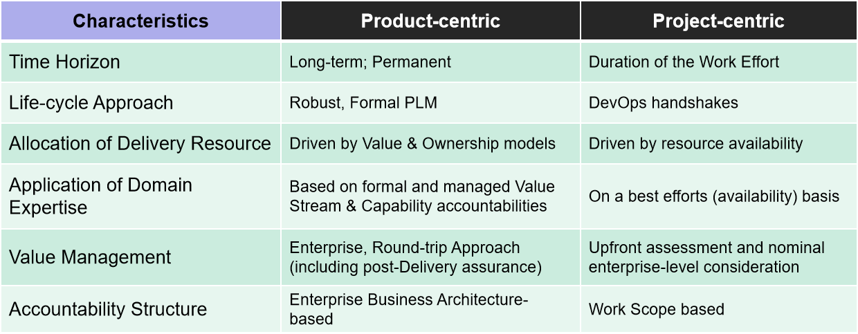 A Product-centric approach, in contrast to a Project-centric one, is focused on The Product (or Service) that you are taking to Market. By keeping the focus on The Product you are constantly reminded that you are building a product, for customers (internal and/or external), as part of an organizational objective that ties back to the over-arching business strategy.