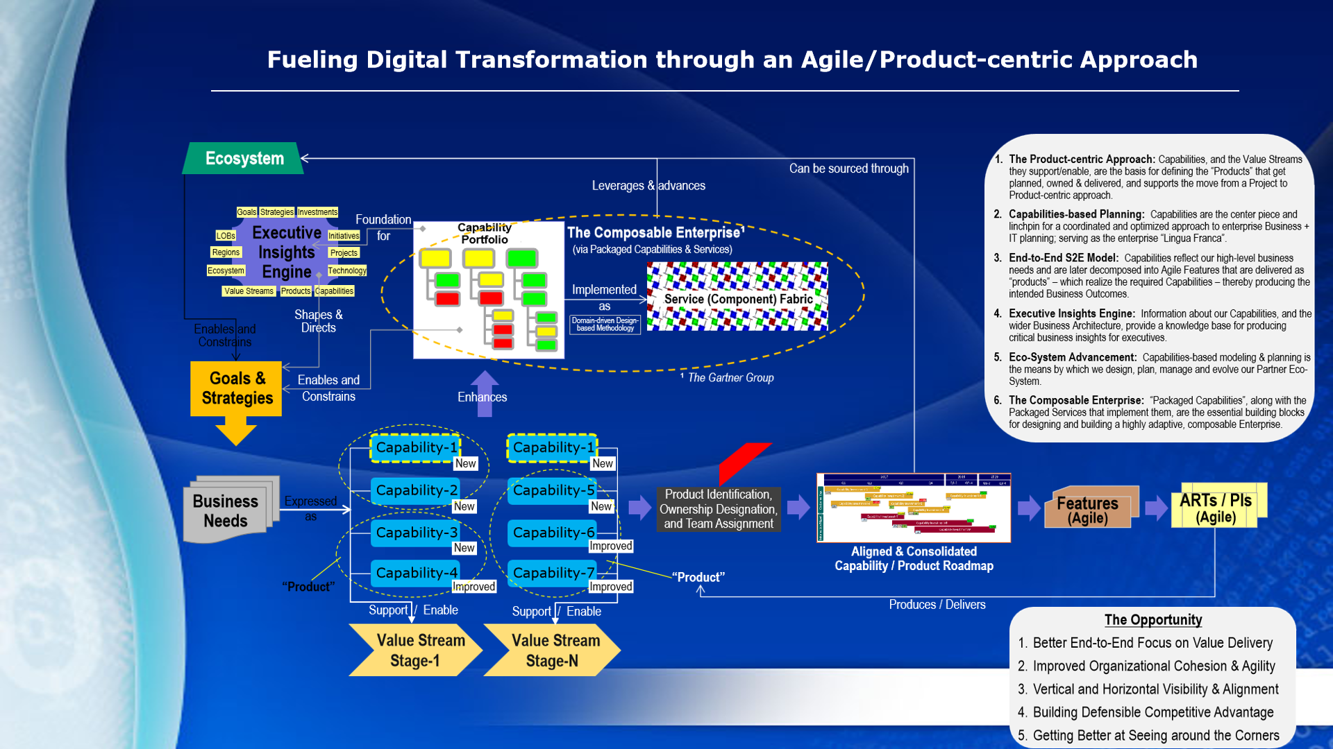 As described in the diagram below, an Agile/Product-centric approach can serve as a linchpin, enabler and driver for delivering a next-generation Digital Transformation Model, including integrated methods and approaches for Capabilities-based Planning, Design Thinking, and The Composable Enterprise.