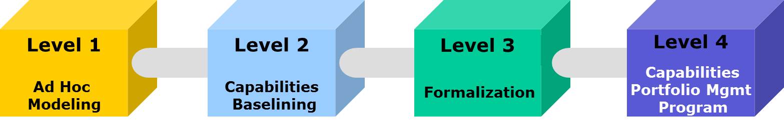 The Business Capability Management Maturity Model contains four Maturity Levels, as shown below: