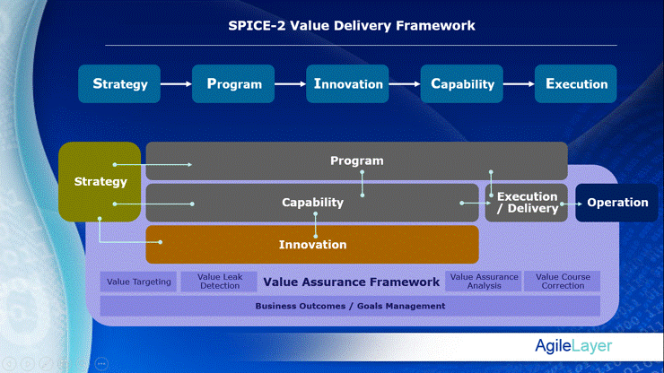 AgileLayer's SPICE-2 Value Delivery Framework helps enterprises deliver high-value, high-innovation strategic programs and transformations. SPICE-2 systemically connects, aligns and supports key components and constituencies in the Strategy-to-Innovation-to-Program Delivery/DevOps process. SPICE-2 prescribes and coordinates Value Assurance and Life-cycle Management processes across Strategy, Program Management, Innovation, Business Architecture and Project Delivery/DevOps functions. The Framework incorporates AgileLayer methods, models, tools and best practices and aligns with industry standards and practices such as Agile/SAFe, PMBOK, BABOK, BIZBOK, and the Business Model Canvas.
