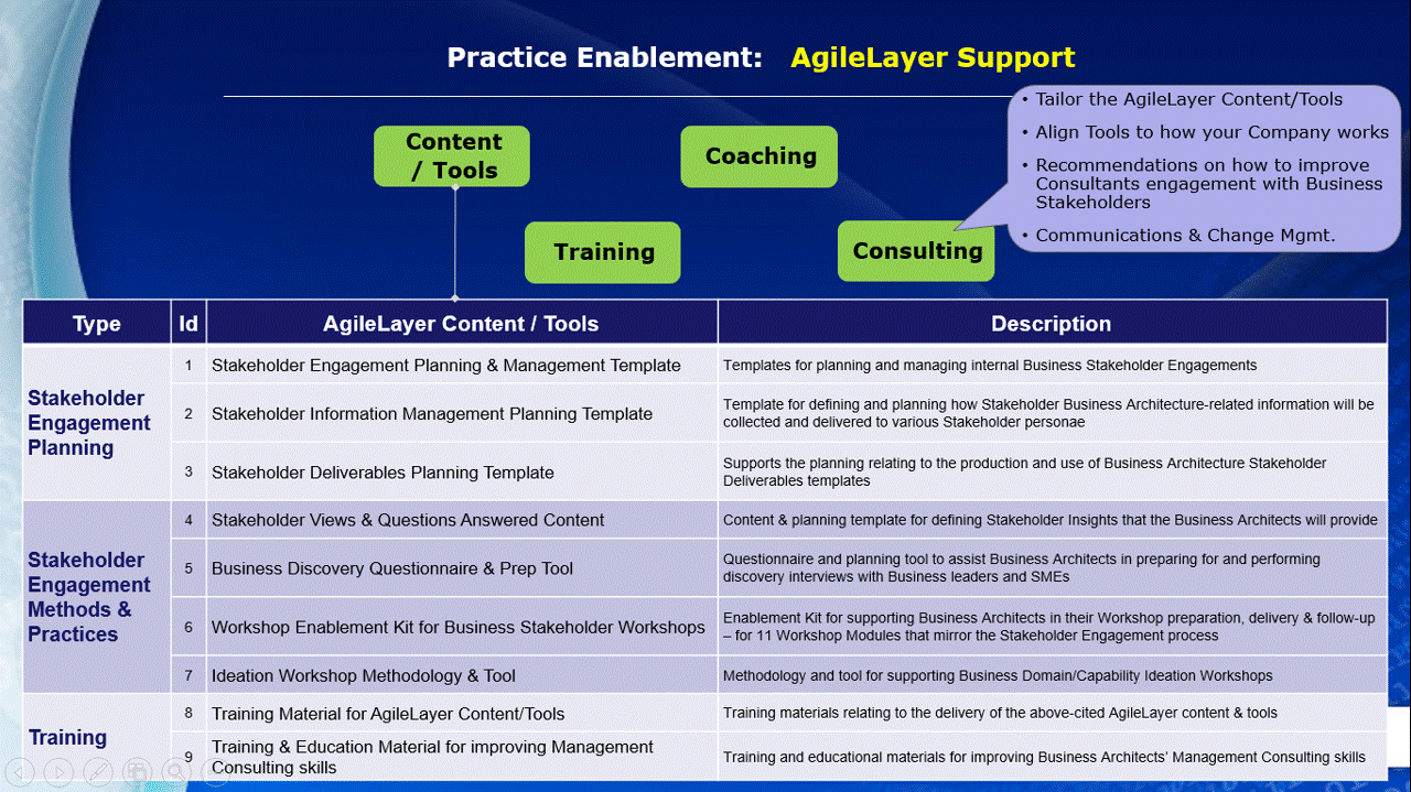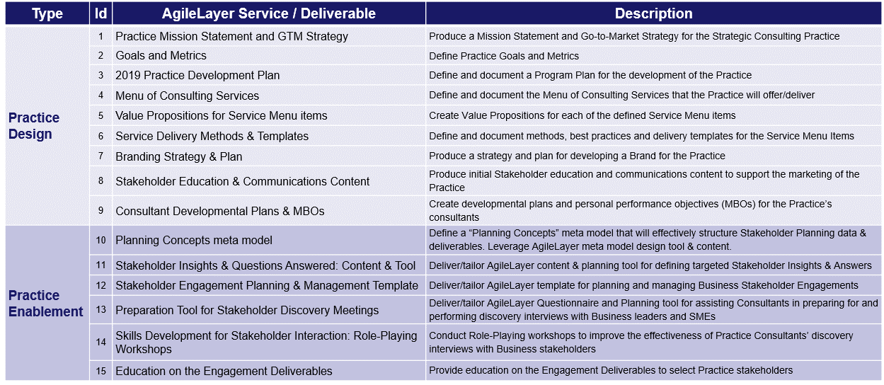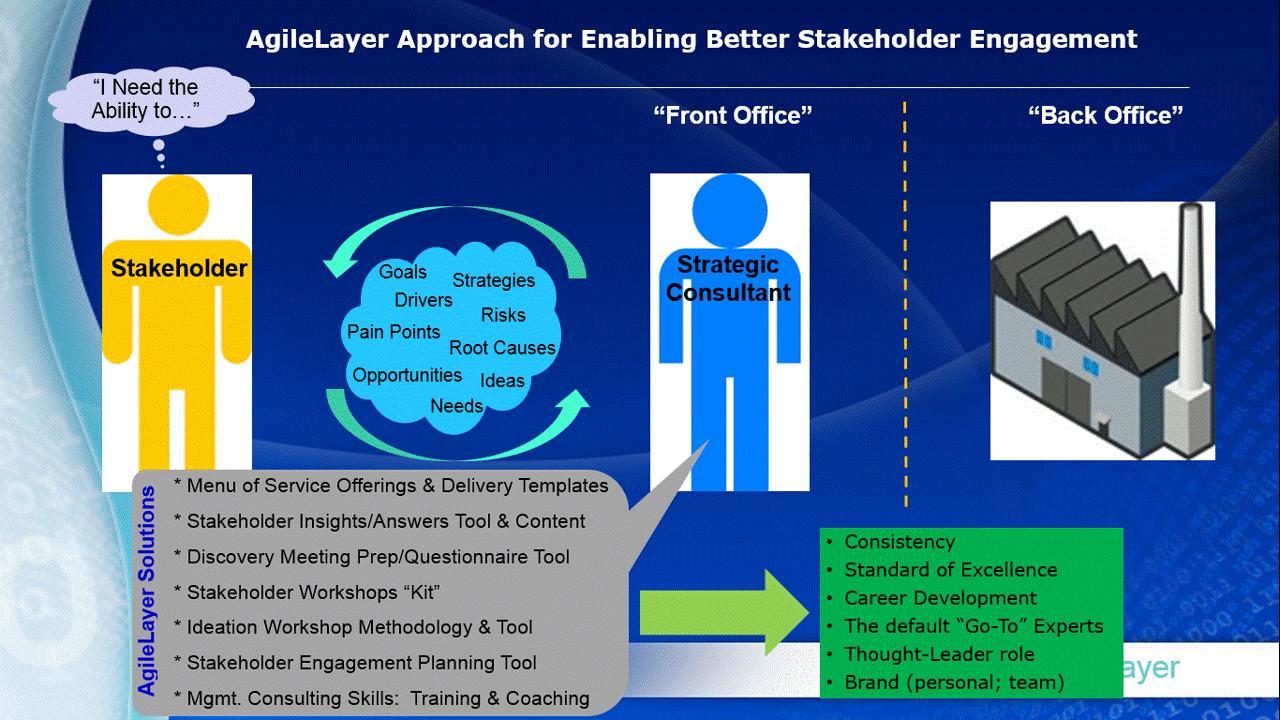 AgileLayer provides expertise, tools, methods and best practices for designing and enabling a company's in-house strategic consulting practice. The AgileLayer solution and approach helps companies to: